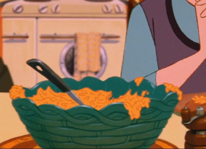 This matter (that probably seems really bizarre unless you're familiar with the likes of Steve Quayle's work) was actually signaled in symbolic imagery as the serving bowl containing the food, found in many scenes on the kitchen table. It is green. Think - Soylent Green, a sci-fi movie where coveted food is made of people. Think - the green-skinned Osiris, a Beast identity. Recall the many green logos addressed in this blog.