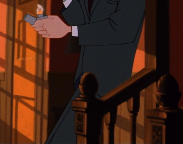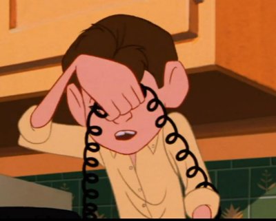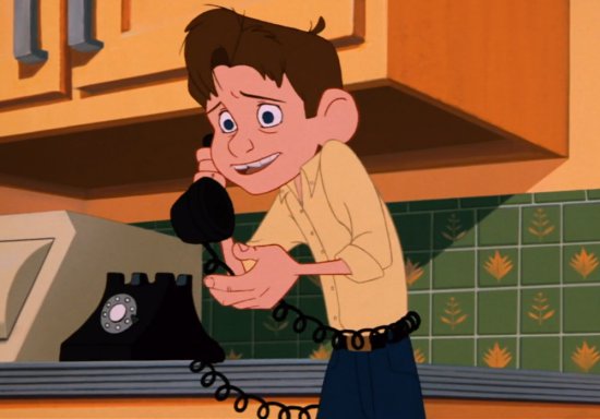 When Hogarth hung up the phone, the helix was still wrapped around him, trapping him. To free himself, he lifted the cord over his head, presenting us with the image on the left.