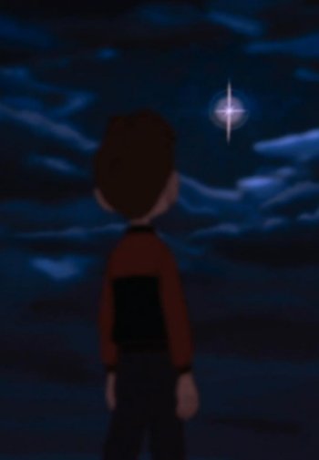 In the plot of The Iron Giant, the giant is killed in the sky, blown up while intercepting a missile. In this image, we see Hogarth looking up at a star that is the radiant light from the blast. The iron giant is a messianic figure who sacrifices himself to save people and is later resurrected. The star supports that theme, presenting us with a cross, which in most peoples' minds represents the instrument of Christ's crucifixion. (Technically, Y'shua was more likely hung on a tree that resembled a vertical stake with no horizontal cross member, but I digress.) The form of the iron giant star is one you might recognize as a Celtic cross, with concentric rings of light around the intersection.