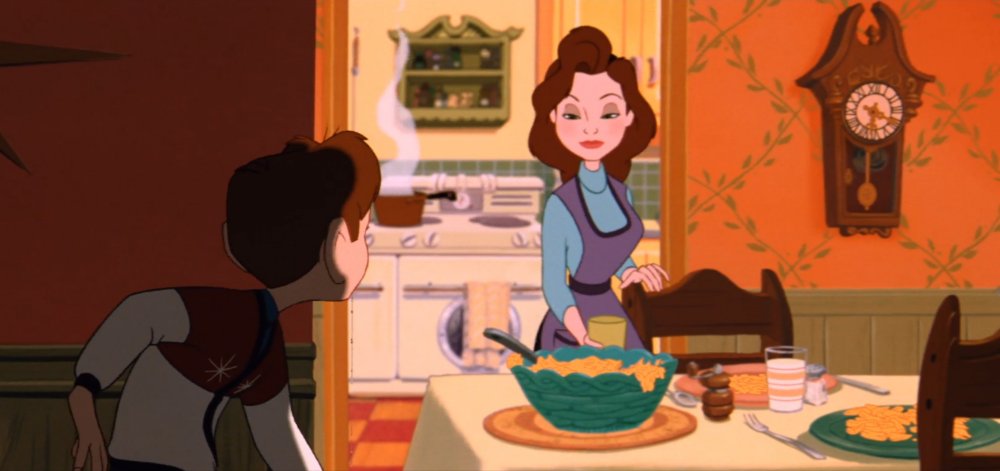 Hogarth's house decor features an oak leaf and acorn motif, with a prominent oak leaf appearing in a forest scene as well. We might expect to see a variety of leaves in the movie, with a mix of maple and elm, perhaps, but the oak is quite dominant. In some contexts, such an observation might be unimportant, but not in such a vehicle as what this is proving to be. The oak and acorn point to Thor, the thunder god, following the movie's Norse cues (the name Hogarth, the iron giant's reassembling / reanimating on Langjökull Glacier, Iceland).