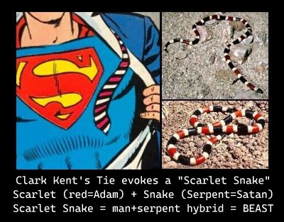 The meaning of Hogarth's scarlet snake-evoking shirt is the same as Superman's tie. The color scarlet is red and because Adam means "red earth," scarlet represents Adamic mankind. The snake references the serpent, an identity of Satan. In the symbol of the scarlet snake, the Adamic mankind and the serpent Satan are combined - as one! Hogarth's shirt signals the hybrid serpent-man with triple-helix DNA.
