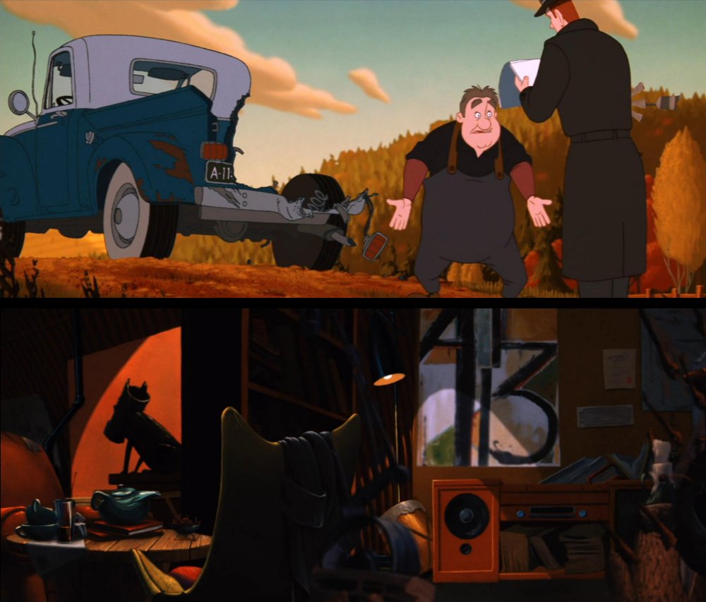 Some observant folks have called out a signaling of A113 that appears as the license plate number of a farm truck that the iron giant had taken a bite out of. It's a little obfuscated because most of the final number is missing, but license plates are where the A113 code is commonly found. Another A113 appears in The Iron Giant that's also pretty well obfuscated. It's hidden in an abstract art poster on a wall of the beatnik artist Dean McCoppen's junkyard home.