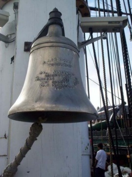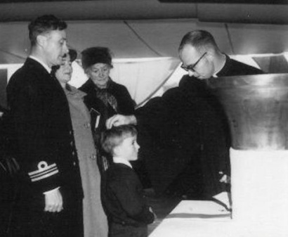 In this picture, a boy is being baptized onboard a Navel vessel. See the inverted ship's bell? "Originating in the British Royal Navy, it is a custom to baptize a child under the ship's bell; sometimes the bell is used as a christening bowl, filled with water for the ceremony. Once the baptism is completed, the child's name may be inscribed inside the bell." (A Brief history of Ships Bells ) What an opportunity for a spell-casting opportunist!