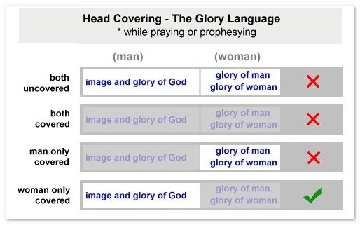 This chart illustrates the glory language, showing how it is across the spectrum of head covering. Regarding the man and woman together, there are four possible combinations: 1. both uncovered, 2. both covered, 3. man only covered, and 4. woman only covered. See the big picture. There's only one model that bears witness to Divine Order. Through simple obedience to the Lord's commands while praying and prophesying, the testimony brought forth for all to witness is an expression of the image and glory of God! The saints enter into God's presence with humility and respect, with no flesh glorying or boasting in His presence!