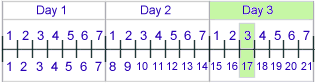 We have observed how seventeen is a significant factor in the number 153. The number 17 is related to the number 3 as it is the other most visible factor in 153, given that 153 = 17 x 9, and 9 is 3 x 3 or 32. Beyond that 17 relates to the number 3 by being what I call a "nested thirds" number. It is the third of a series doubly applied. Consider the following representation of three weeks or three sets of seven units in sequence. Within the third set of sevens, the third unit is number 17 of 21.