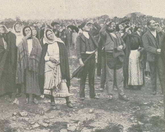 (Wikipedia) "As early as July 1917 it was claimed that the Virgin Mary had promised a miracle for the last of her apparitions on October 13, so that all would believe. What happened then became known as the "Miracle of the Sun". A huge crowd, variously estimated between 30,000 and 100,000, including newspaper reporters and photographers, gathered at the Cova da Iria. The incessant rain had ceased and there was a thin layer of cloud. Lucia, seeing light rising from the lady's hands and the sun appearing as a silver disk, called out "look at the sun". She later had no memory of saying this. Witnesses later spoke of the sun appearing to change colors and rotate like a wheel. Witnesses gave widely varying descriptions of the "sun's dance". Poet Afonso Lopes Vieira and schoolteacher Delfina Lopes (with her students and other witnesses in the town of Alburita), reported that the solar phenomenon was visible up to forty kilometers away."