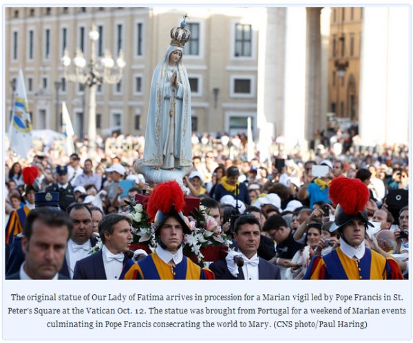 From the news article, Venerating Fatima statue, pope entrusts world to Mary: