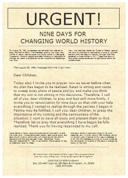 In the preceeding months, my life had been dramatically impacted by the revelation of a celestial sign, which marked the Lord's return in judgment. (See Jacob's Dying Words Prophesy the Celestial Sign of the Lord's Return in Judgement) As a result, I had been passionately seeking to understand more fully what it meant and what the Lord would have me do about it. I had seen validation of various kinds already, and when I read the notice given to me by my sister-in-law I noted with interest that there was a very direct correlation. The report was headlined, "URGENT! NINE DAYS FOR CHANGING WORLD HISTORY." I've reproduced it here, URGENT Notice from Caritas of Birmingham. The Catholics who had interpreted the message received through the Marian apparition from Medjugorje, Herzegovina, proclaimed, "These nine days will have global consequences and its significance cannot be overestimated." Those nine days represented the same period highlighted by the celestial sign! While the message was filled with lies, it was wrapped around nuggets of truth, as such things must be, and precious beans were spilled in the process. I knew the sign was a world changing matter and so did those who were giving heed to the Marian apparition. In that way, through the Lord's using the phenomenon as a witness of the counterfeit to validate what He Himself had shown me as the genuine, I knew that the Marian herald was to be watched as a sign.