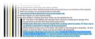 45 Who then is the faithful and sensible slave whom his master put in charge of his household to give them their food at the proper time? 46 Blessed is that slave whom his master finds so doing when he comes. 47 Truly I say to you that he will put him in charge of all his possessions. 48 But if that evil slave says in his heart, "My master is not coming for a long time," 49 and begins to beat his fellow slaves and eat and drink with drunkards; 50 the master of that slave will come on a day when he does not expect him and at an hour which he does not know, 51 and will cut him in pieces and assign him a place with the hypocrites; in that place there will be weeping and gnashing of teeth.
