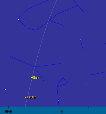 Jupiter and Mercury entered "between the feet" when they passed conjunction with Regulus. Again, this is what really grabbed my attention because Mercury met Jupiter at Regulus in very close proximity! Jupiter was in conjunction with Regulus on the 10th at about 9:30 am. Mercury came into conjunction with Regulus at about Noon. Twenty-five minutes later, Mercury came into conjunction with Jupiter. (10:08:01 RA) A few hours later, the appearance of the new Moon announced the arrival of Yom Teruah at sunset. (17:52, or, 5:52 pm) RA indicates Right Ascension values. Bodies in conjunction have the same RA. To give the more technically minded among you an idea of the relative motions, Regulus has a fixed position at 10:07:55 RA, so when the planets are in conjunction with Regulus they have an identical RA value. By sunset, Jupiter had moved to 10:08:13 RA, and the quickly accelerating Mercury, to 10:09:12 RA.