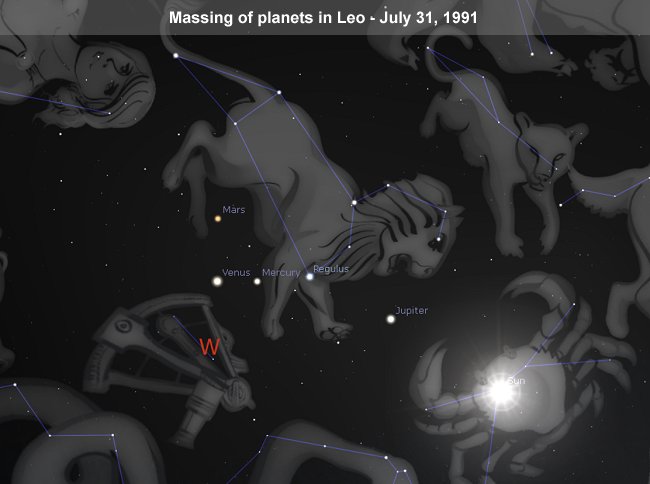I had just bought my first computer and had installed an astronomy program. With it, I was able to view the heavens as they were at any given time in history and as they are expected to be in the future, if they continue consistently. When I got home from work, I used the animation function to set the planets in motion and observed their positions relative to each other and against the backdrop of the stars. By means of this simulation, I previewed on my computer the events I would see in the heavens over the coming months. It was just as the weatherman had said. Three planets were lined up. The slowest one was in the lead and the fastest moving one was behind the slower two. Eventually, in mid June, the three planets came really close together, bunching up in the constellation Cancer. Then the fastest one passed the other two and moved out front, while the slowest one dropped into the last position. They were inverted. This was fascinating to me and I watched the animation several times. As I let the animation run on through the summer months to see if anything else interesting was going to happen I came to a startling realization! On my monitor there appeared a familiar configuration, a massing of the planets Mars, Mercury, Venus and Jupiter in the Zodiacal constellation Leo!